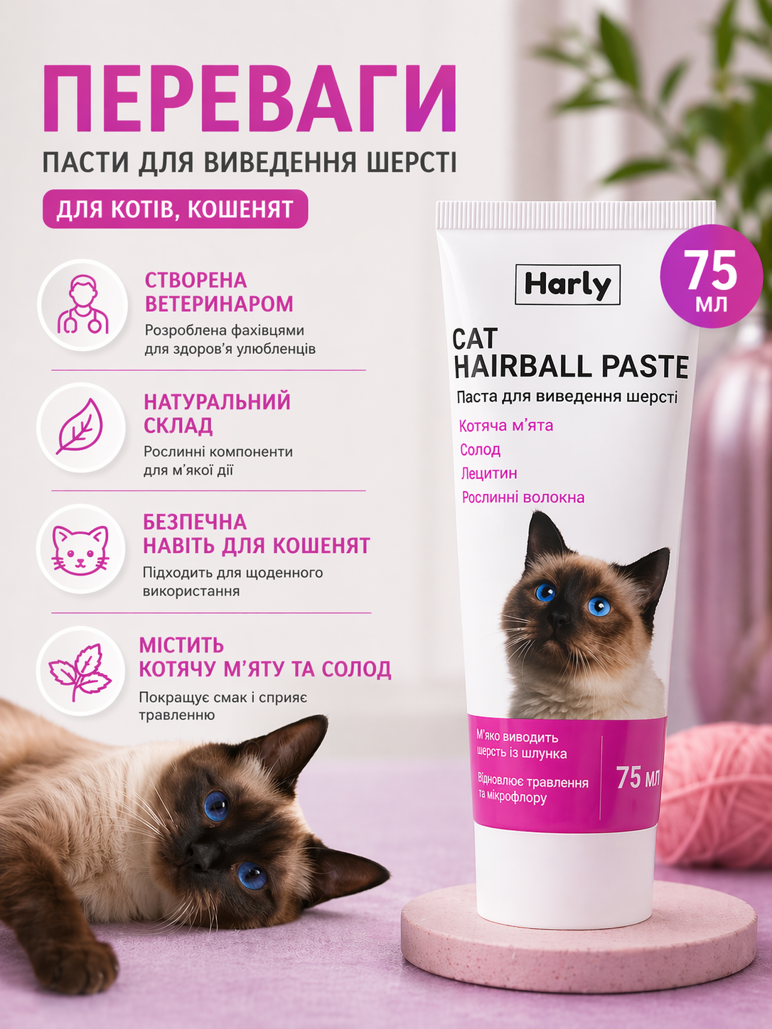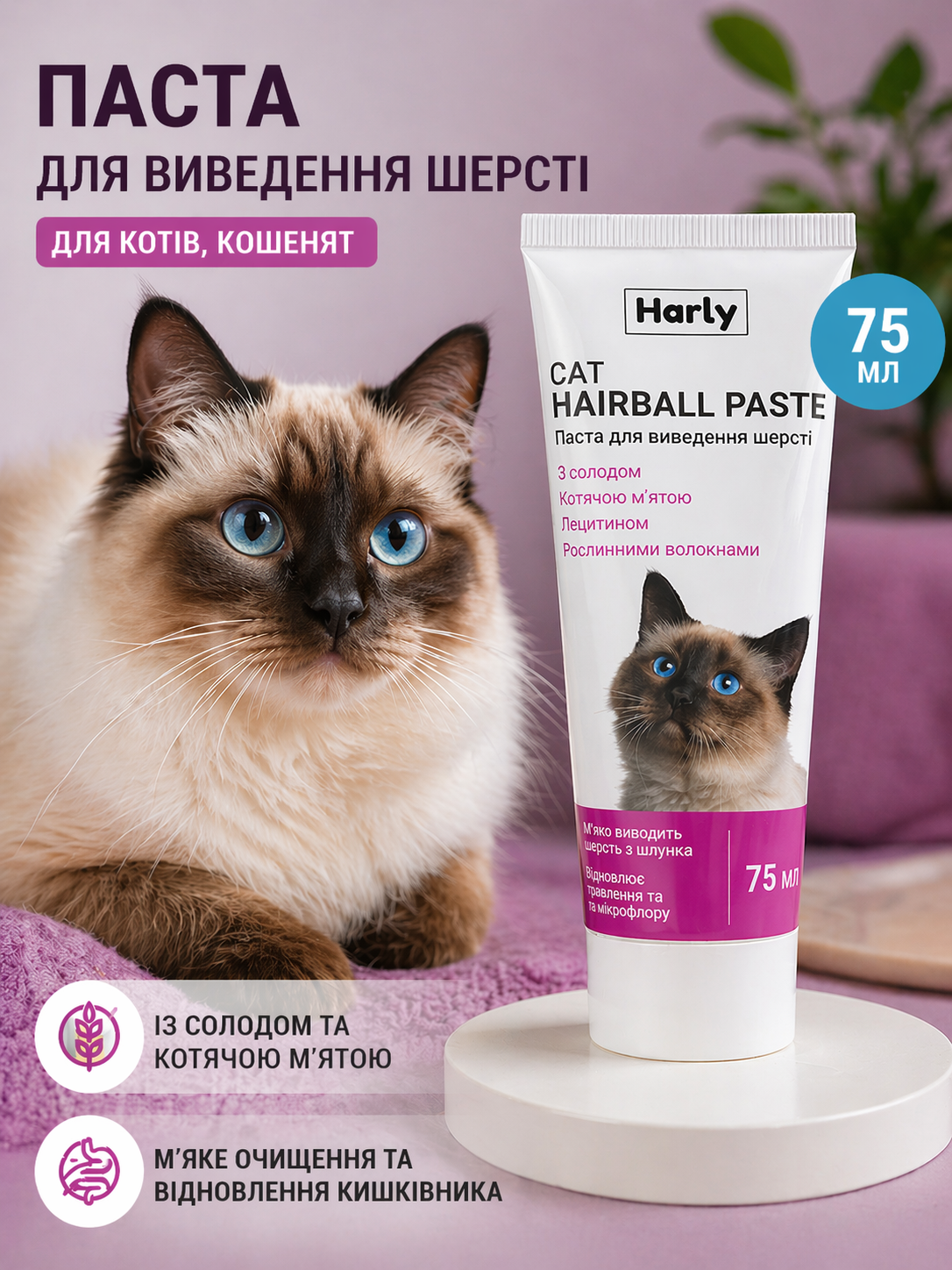 М’яко виводить шерсть зі шлунка та запобігає утворенню грудочок. Підтримує здорове травлення і комфорт вашого улюбленця.