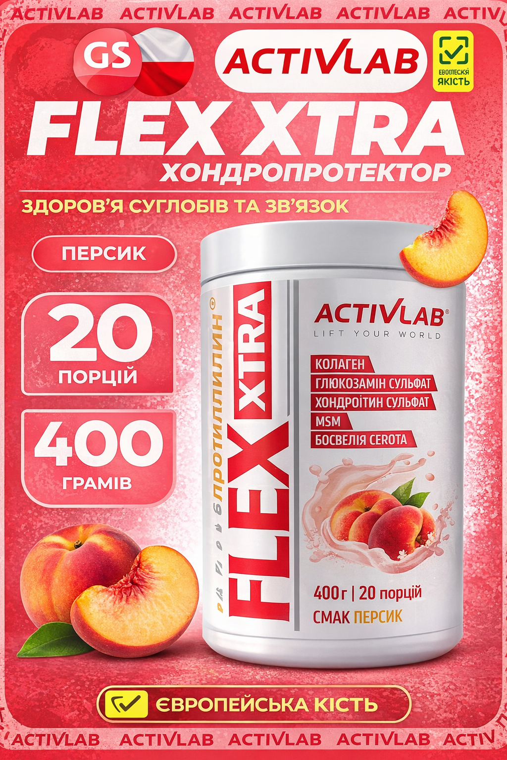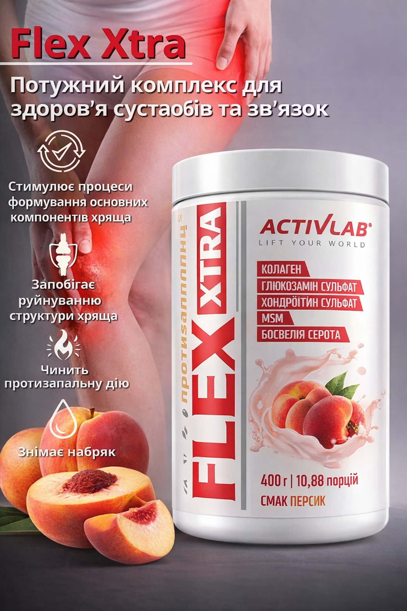 Flex Xtra — легкість руху без дискомфорту. Потужна формула для суглобів і зв’язок допомагає зняти напруження, зменшити запалення та підтримати відновлення після навантажень. Більше свободи в русі щодня. Смак персик, 400 г.
