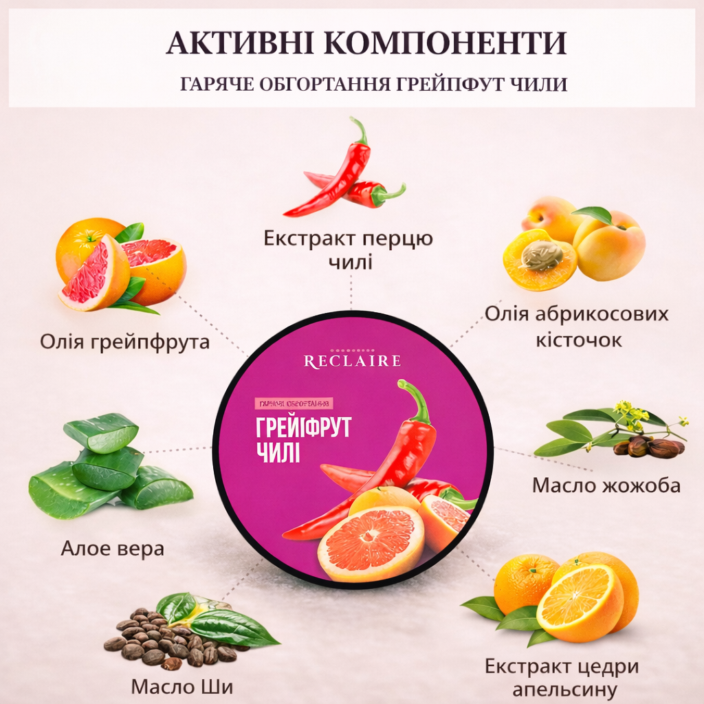 Гаряче обгортання “Грейпфрут-Чилі” створене для активного впливу на проблемні зони. Формула з екстрактом перцю чилі розігріває шкіру, стимулює мікроциркуляцію та допомагає покращити обмінні процеси.